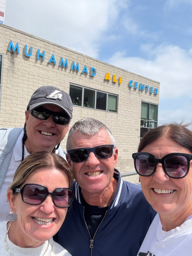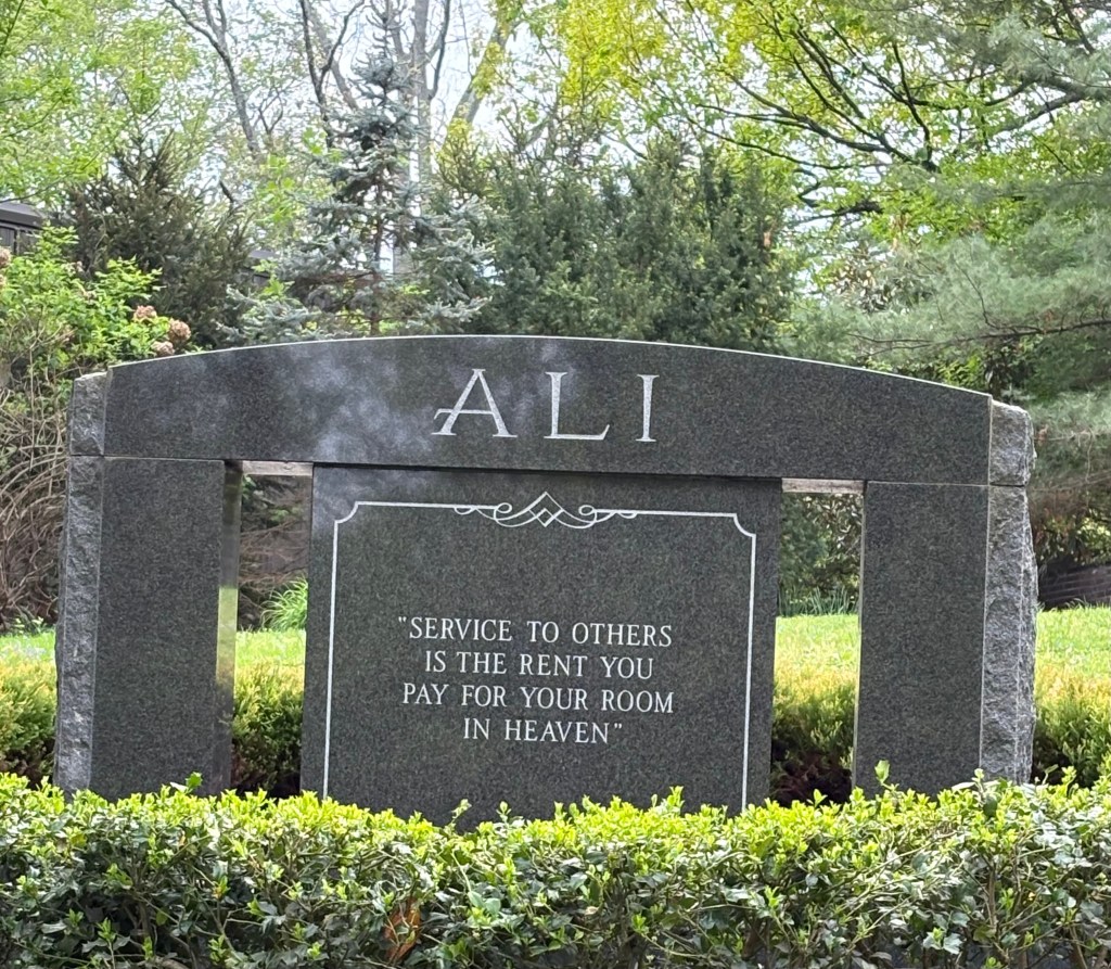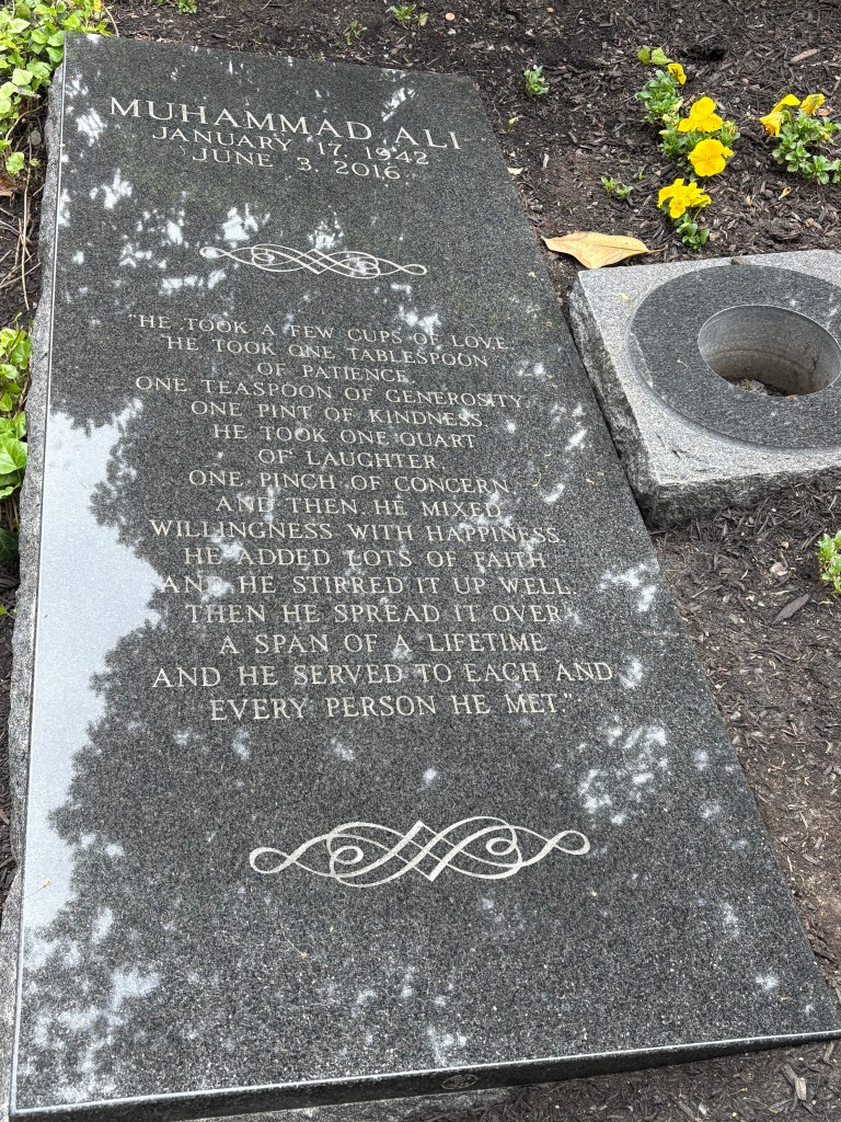 After the museum we headed over to Cave Hill cemetery around 20 mins drive away. After a little bit of driving around in what was is a beautiful cemetery, we eventually found his grave which is a simple headstone with ALI written on it. There is a further inscription that says ‘Service to others is the rent you pay for your room in heaven.’ The site also includes two granite benches for sitting and reflection. Overall, we were very glad we made the effort to come and see his grave and we reflected on a lovely day as we headed back to the hotel.