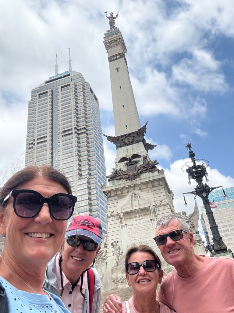 After a few more pics outside we headed to the city and the centre piece of Indianapolis, city the ‘Soldiers and Sailors Monument’. This thing is nearly 300 feet tall and is one of the tallest monuments in the USA (only 15 feet shorter than the Statue of Liberty). It’s located in monument circle, which is a central plaza and acts as the city’s main gathering spot with historic buildings, shops and restaurants surrounding it. The monument was built around 1900 and its main purpose is to honour and remember Indiana’s military veterans, especially those who served in the American Civil War. Anyway, it’s very impressive, with a number of bronze statues, water features and some incredible sculptures. We described it as Nelson’s column on steroids as poor old Nelson can only manage 169 feet in height. Some more pub quiz knowledge for you all though.