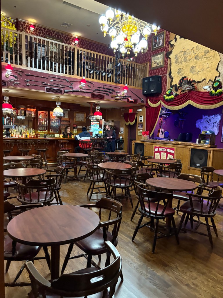 Returning as planned, dinner was in a restaurant that looked straight out of the Wild West and even more bizarre there was the saloon next door complete with swing doors. We all tucked into the buffalo stew that came in a bread bowl and Ian also had the 12 ounce buffalo steak, which was very nice.