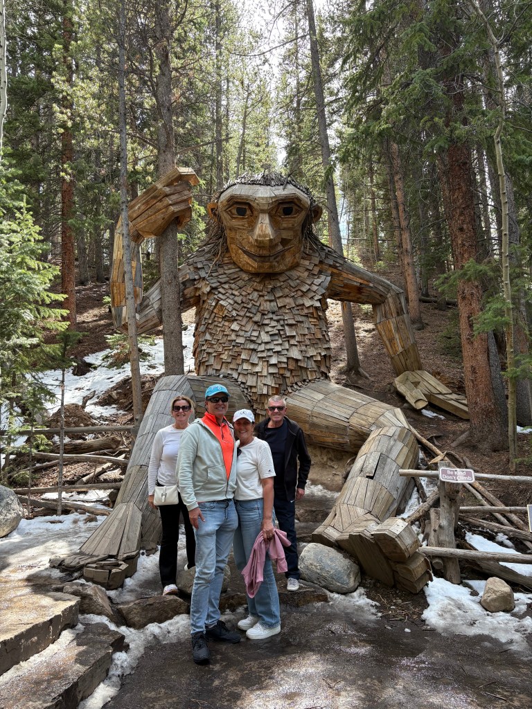 We set off and descended quickly to around 9,600 feet above sea level and the ski resort town of Breckenridge. This place was amazing full of ‘boujee’ restaurants, bars and shops surrounded by the incredible mountains. It even had a small ‘boujee’ Starbucks (those guys get everywhere). We had lunch in one of the ‘boujee’ restaurants before setting off back to the city, stopping off for a few minutes to see a giant wooden troll built by a Danish Sculptor (don’t ask).